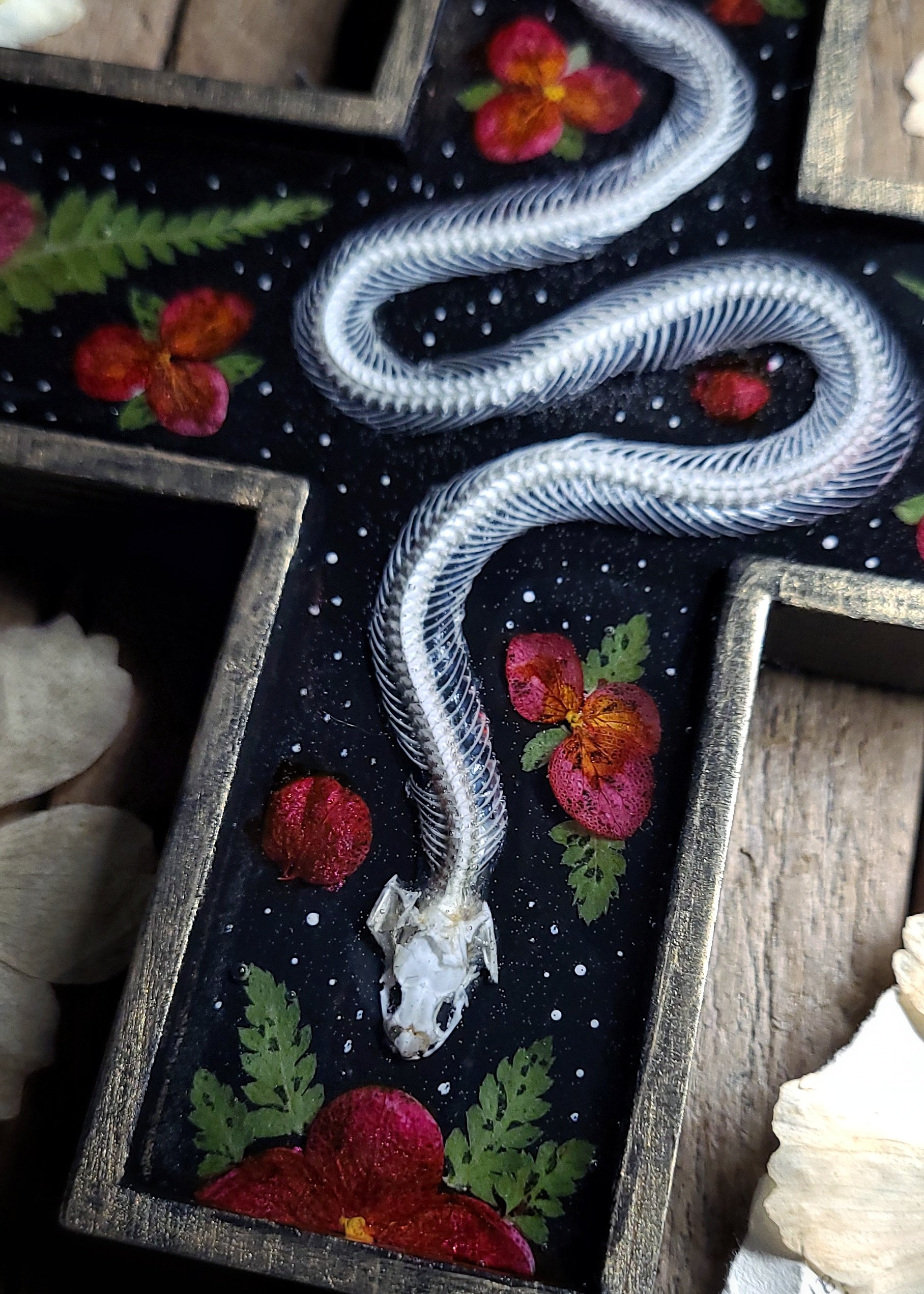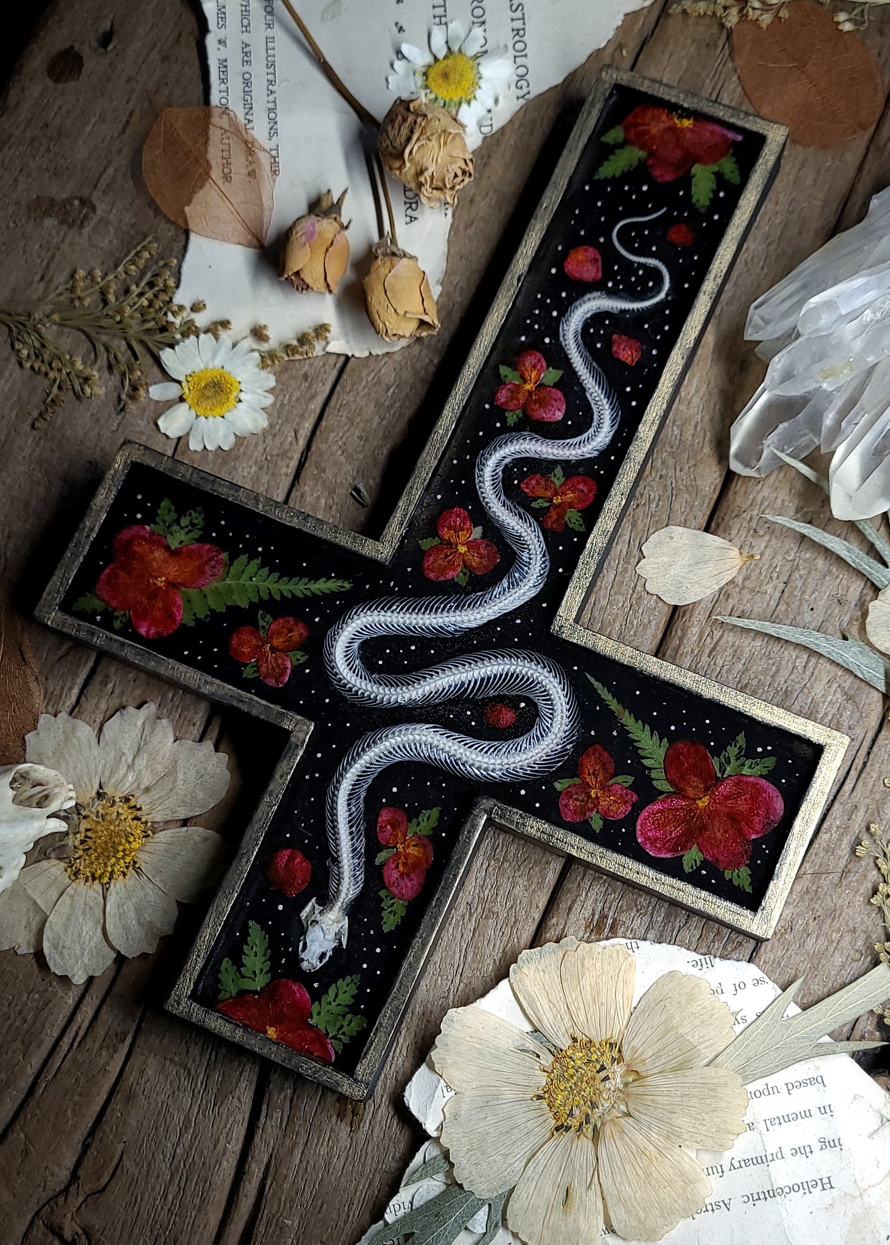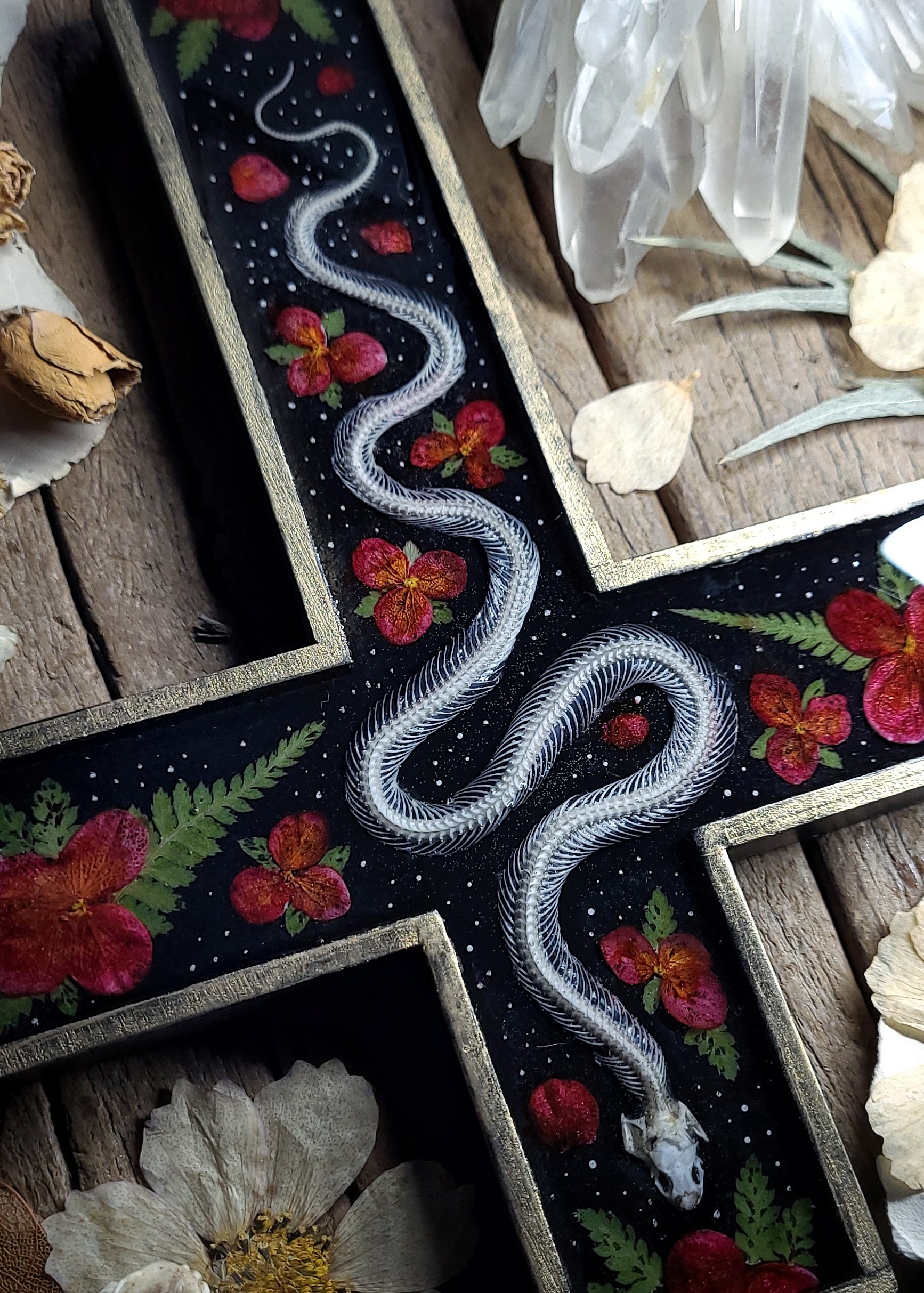 An articulated snake skeleton -processed from road casualty specimen with natural damage (such as crack in skull) is surrounded by dried red wildflowers and ferns, sealed under clear resin in a wooden wall cross in black and brushed gold.