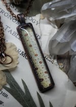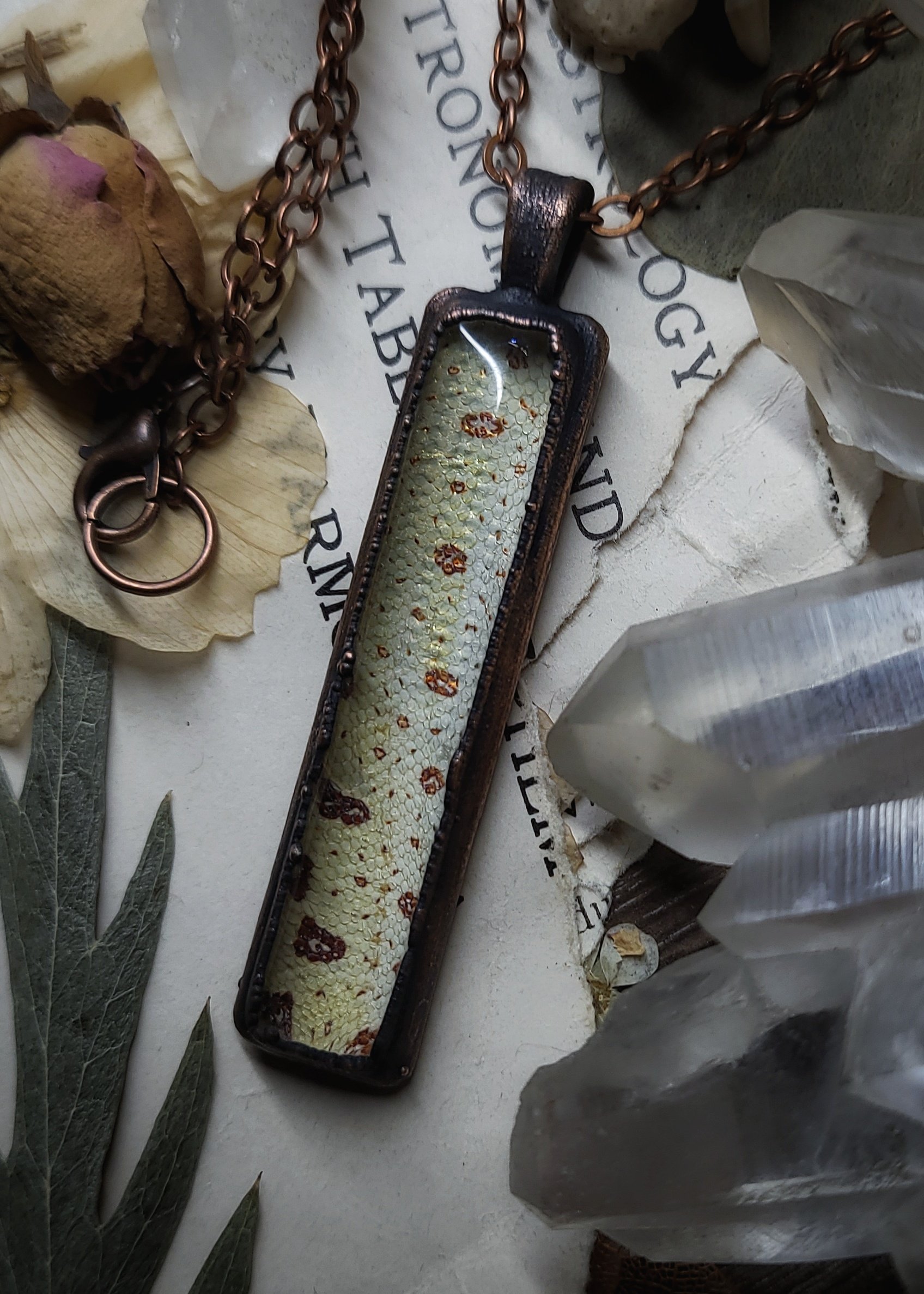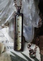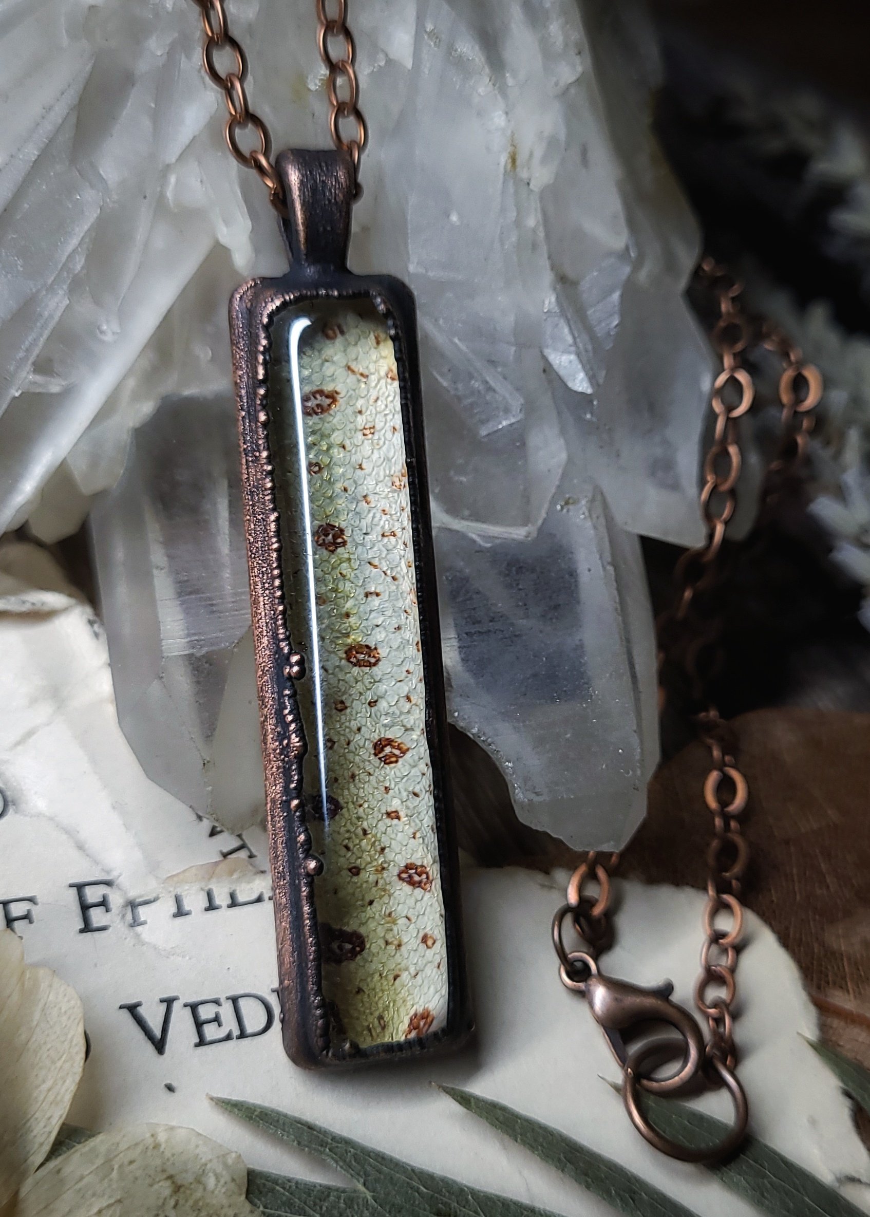 A beautifully patterned section of preserved yellow green tree python skin is sealed under domed glass inside of a rustic oxidized copper framed pendant.