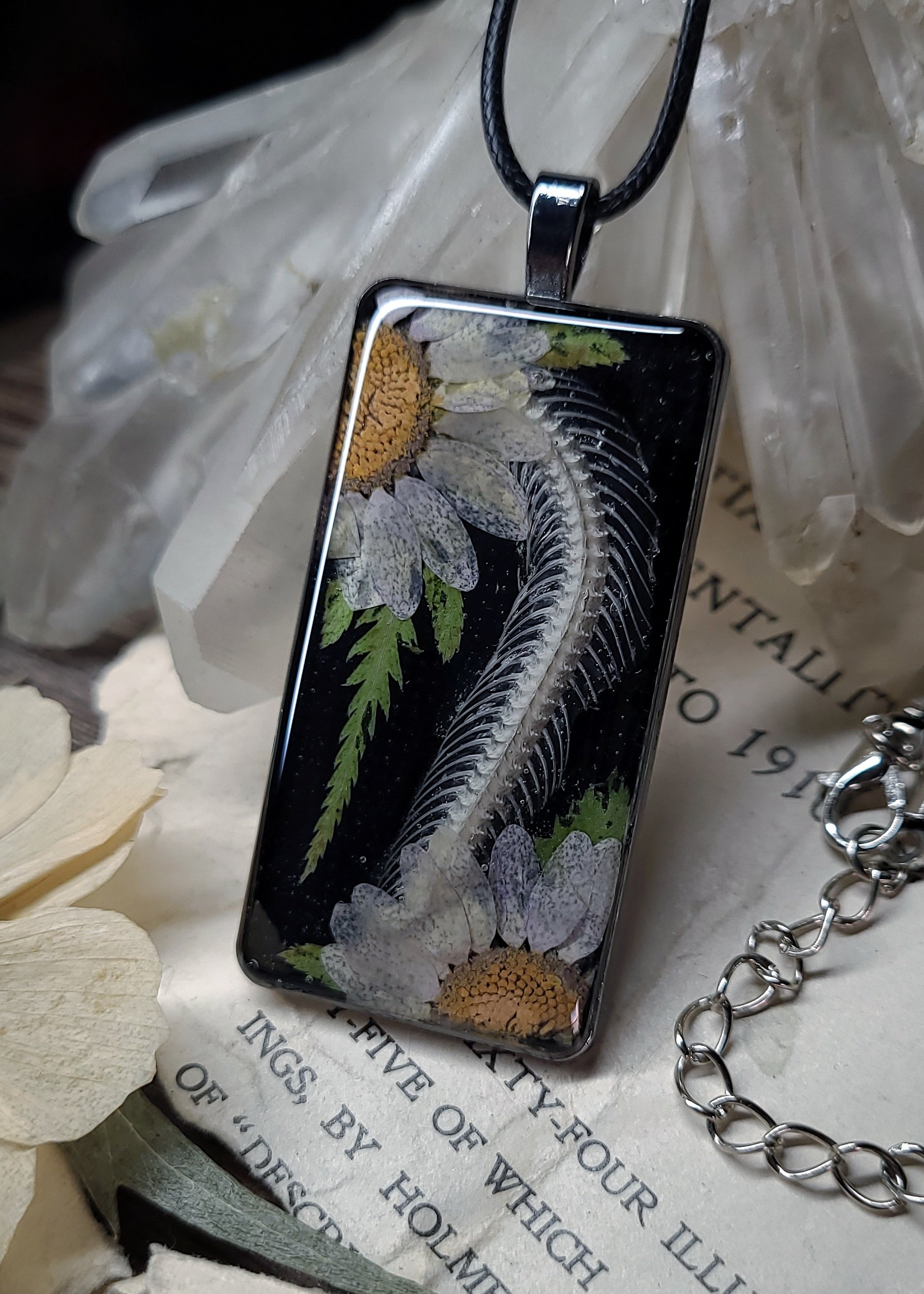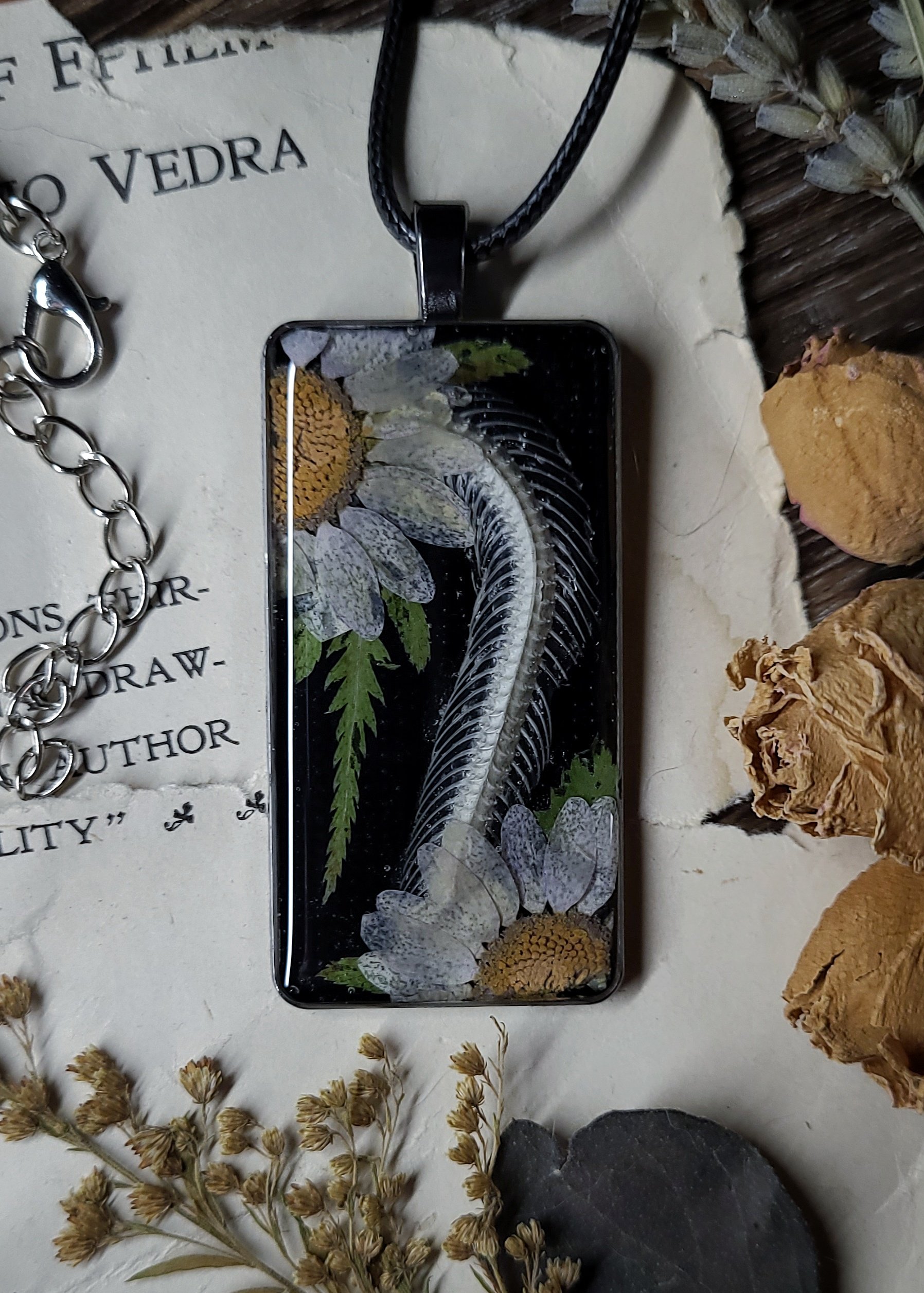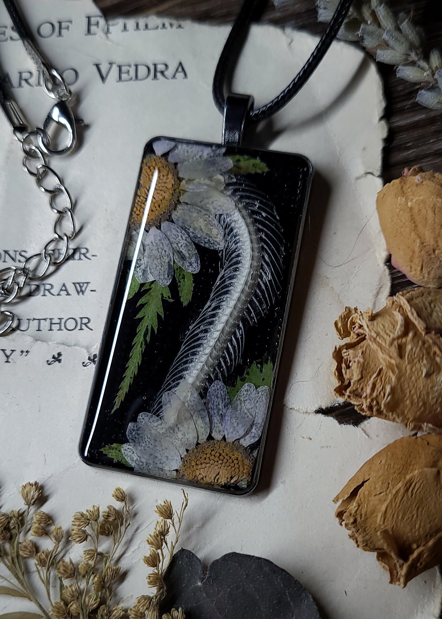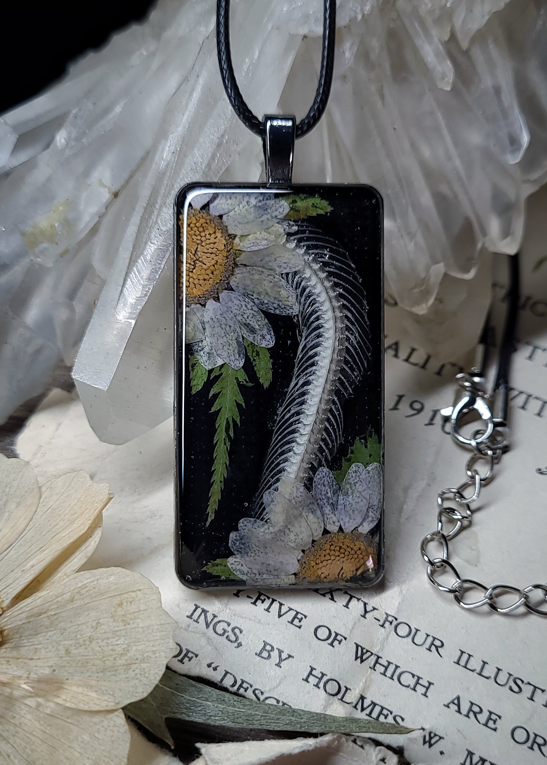 A section of snake spine and rib bones with large dried daisy flowers is sealed in clear resin on a shiny black background and framed in large rectangle silver brass charm pendant.