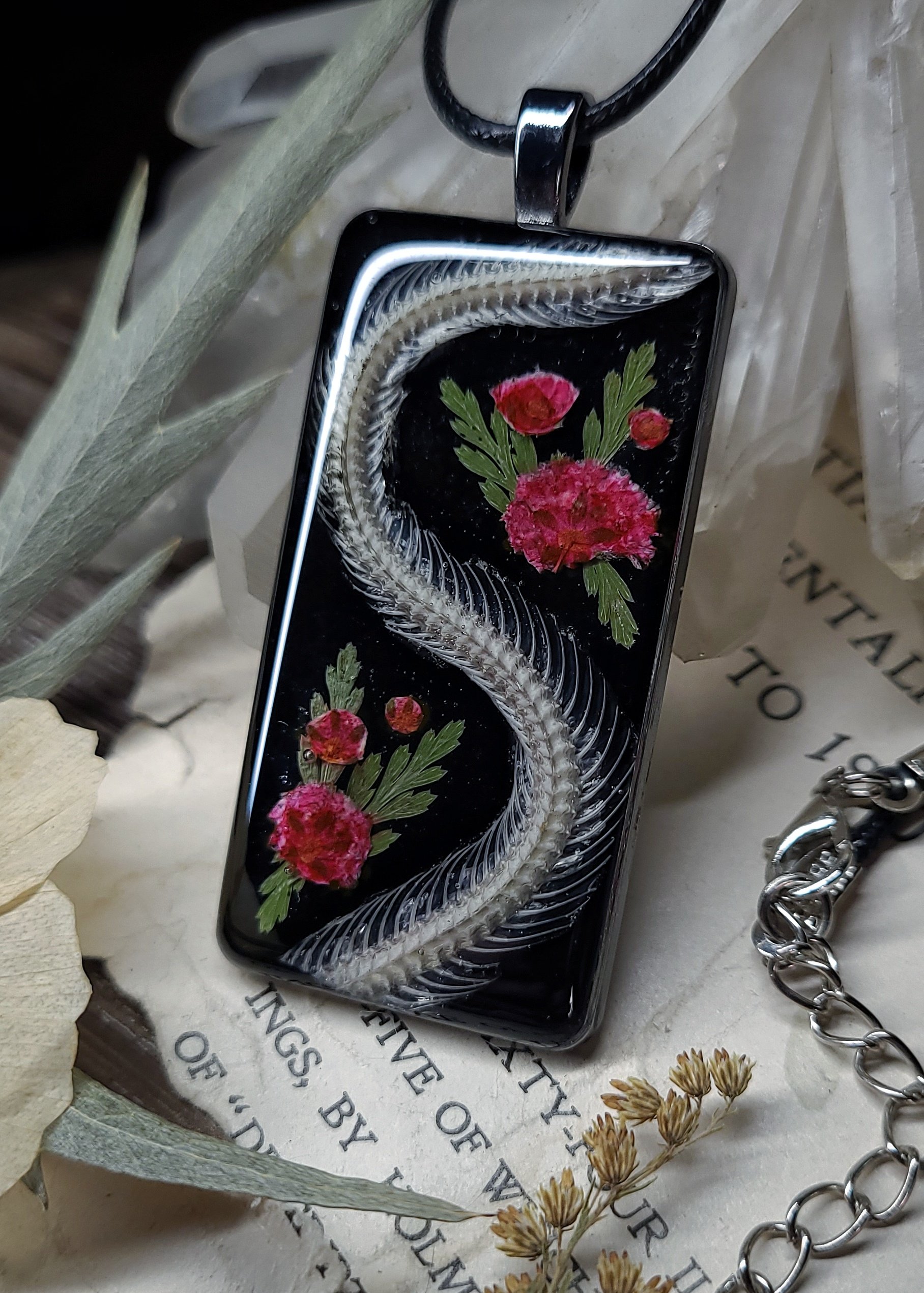 A section of snake spine and rib bones with red wildflowers and ferns is sealed in clear resin on a shiny black background and framed in large rectangle silver brass charm pendant.