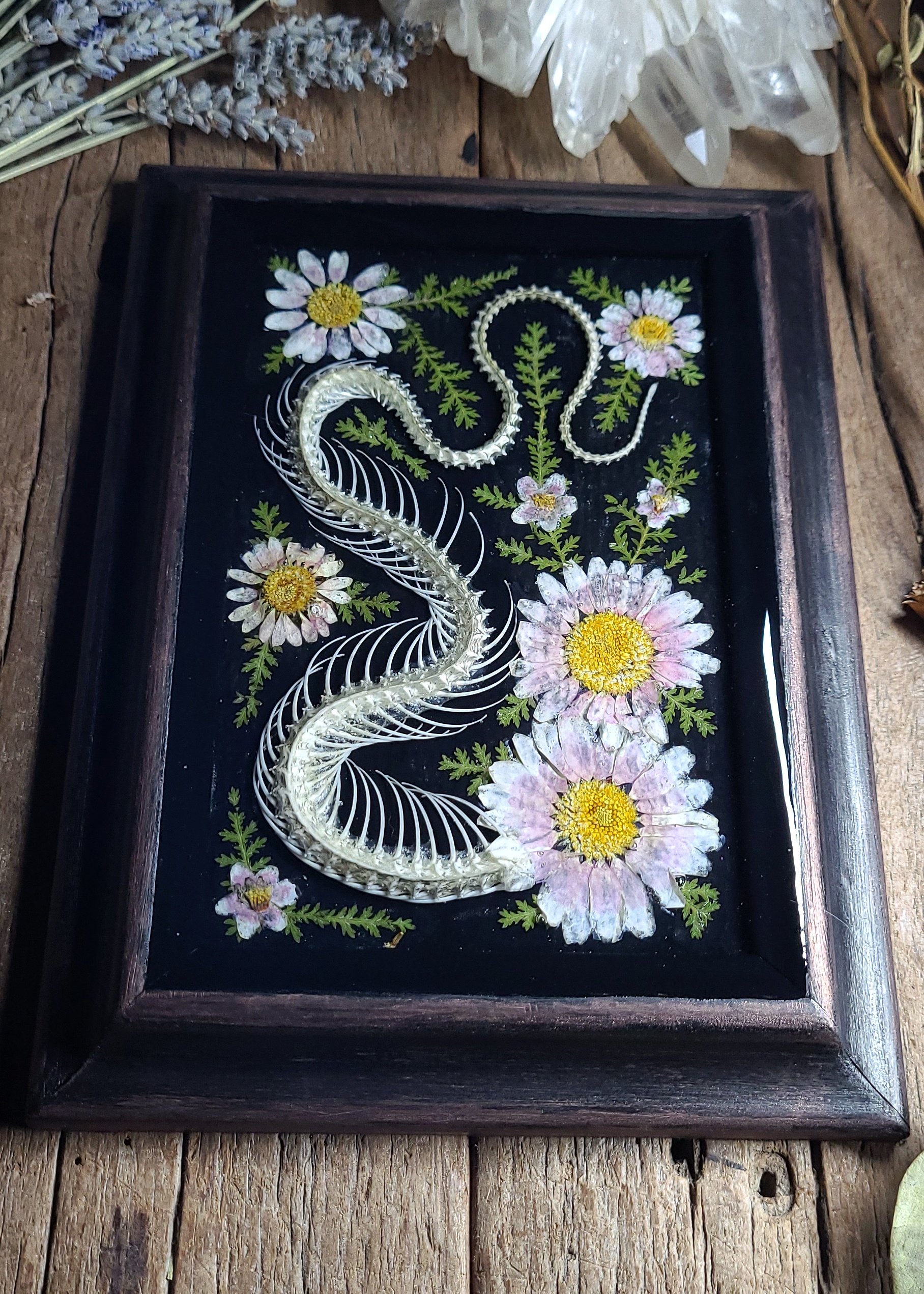 A large tail section of articulated snake spine and ribs - processed from road casualty specimen with natural damage - is coiled on a black background and surrounded by dried pressed pink daisies and ferns, sealed under clear resin in a vintage rustic wood wall frame in black and dark brushed bronze.