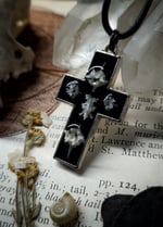 Multiple snake vertebrae bones are sealed with clear resin, partially protruding, inside of a silver brass cross shaped pendant.