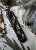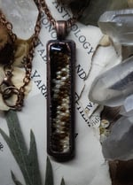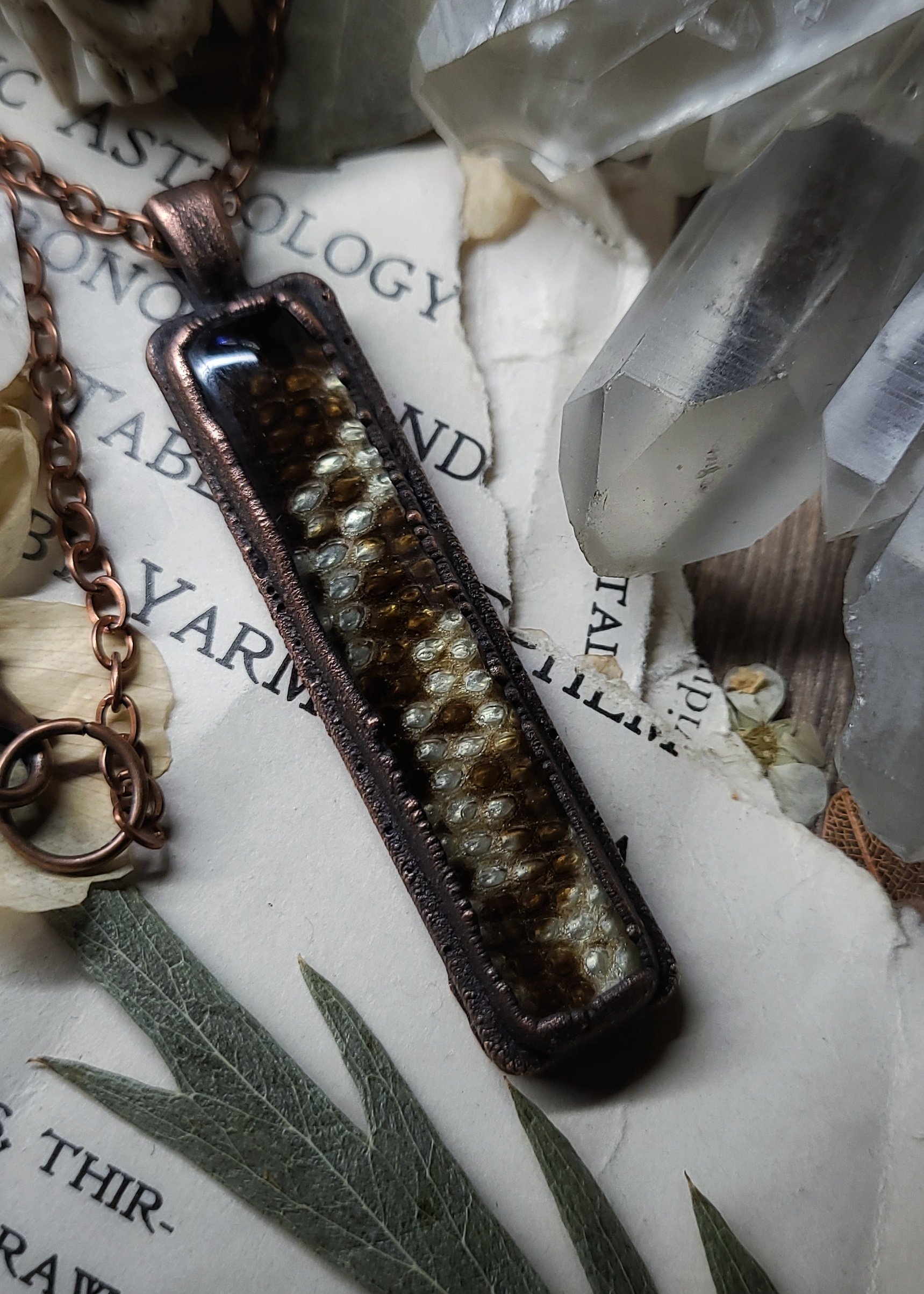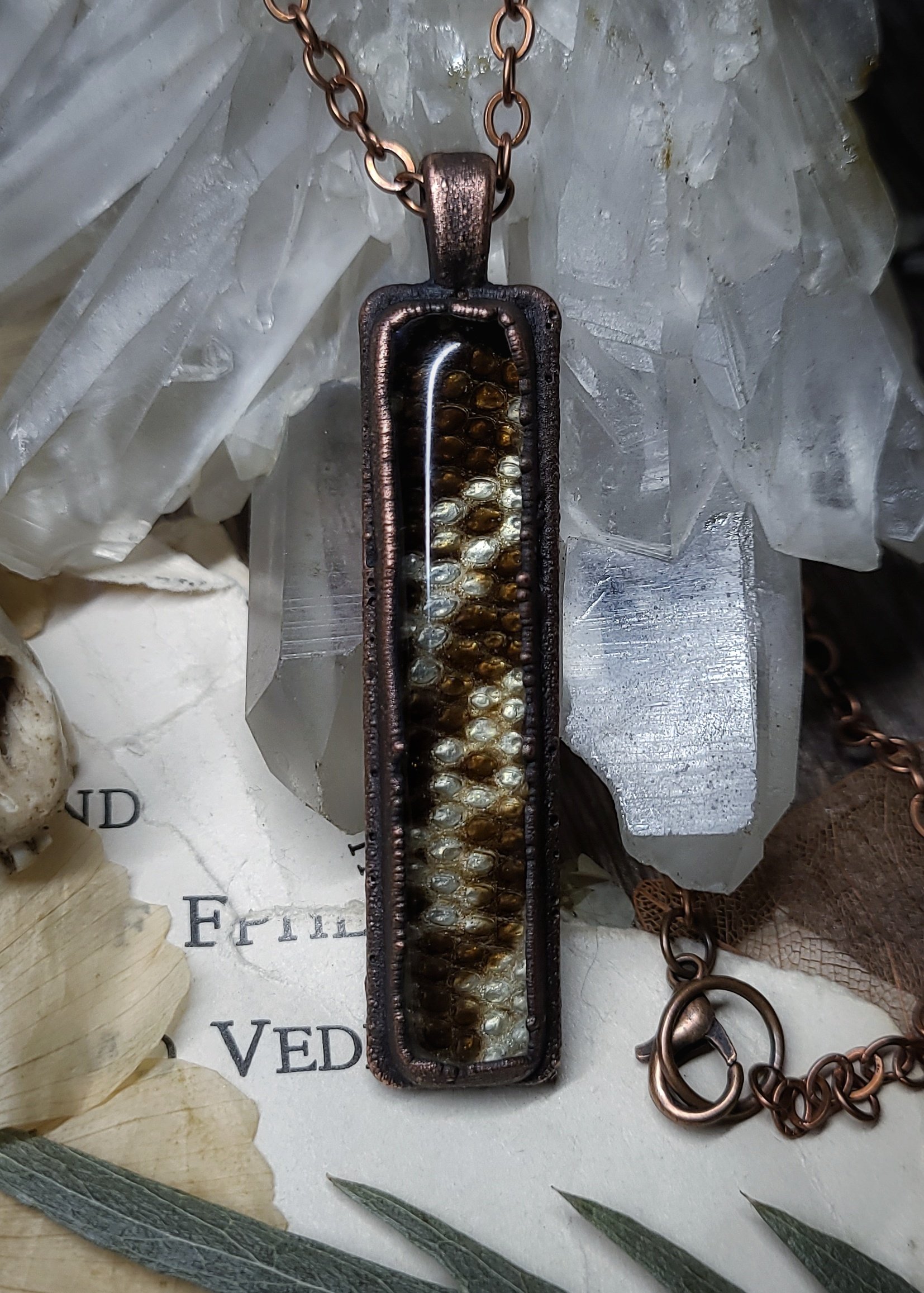 A beautifully patterned and textured section of preserved tegu lizard skin is sealed under domed glass inside of a rustic oxidized copper framed pendant.
