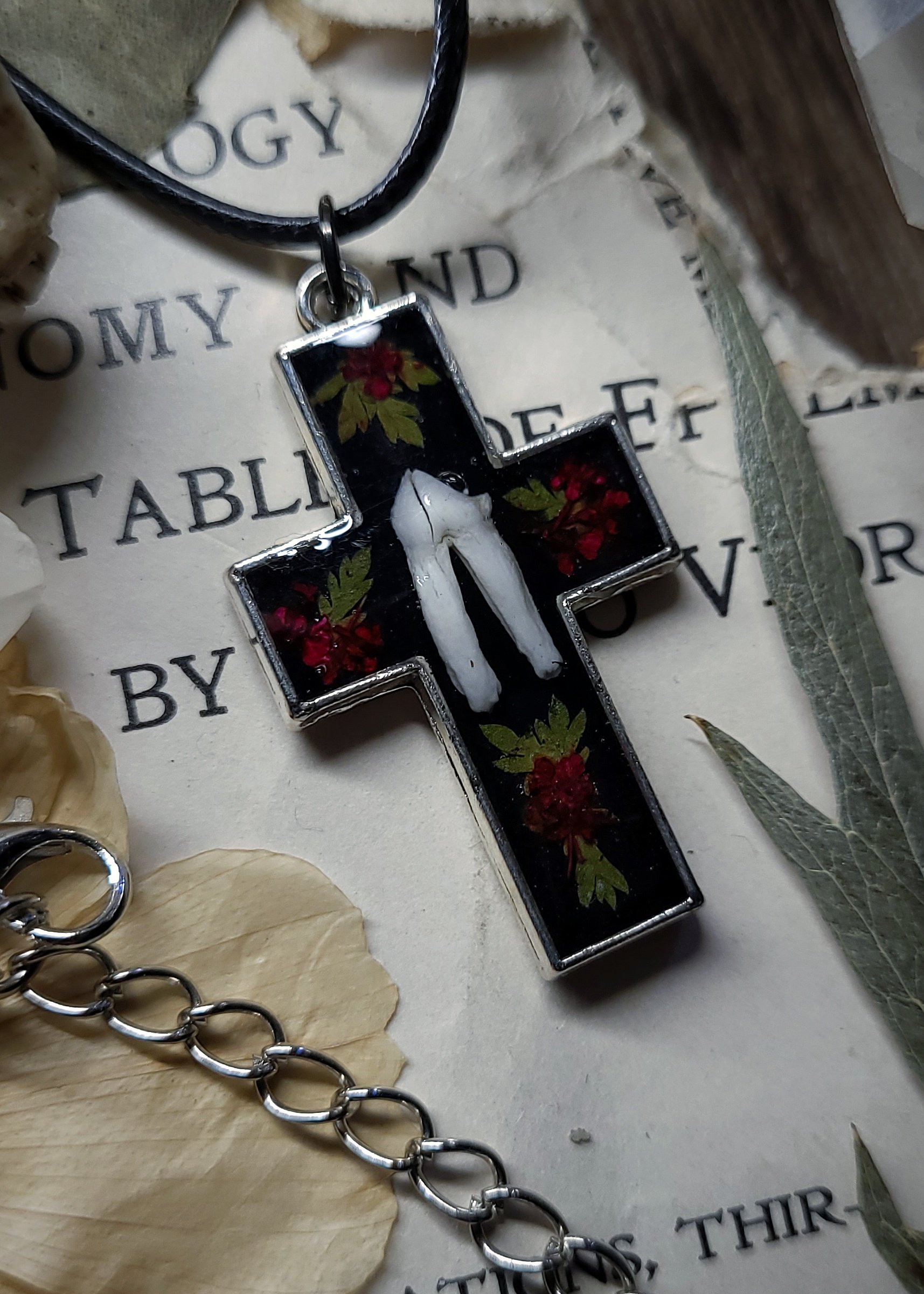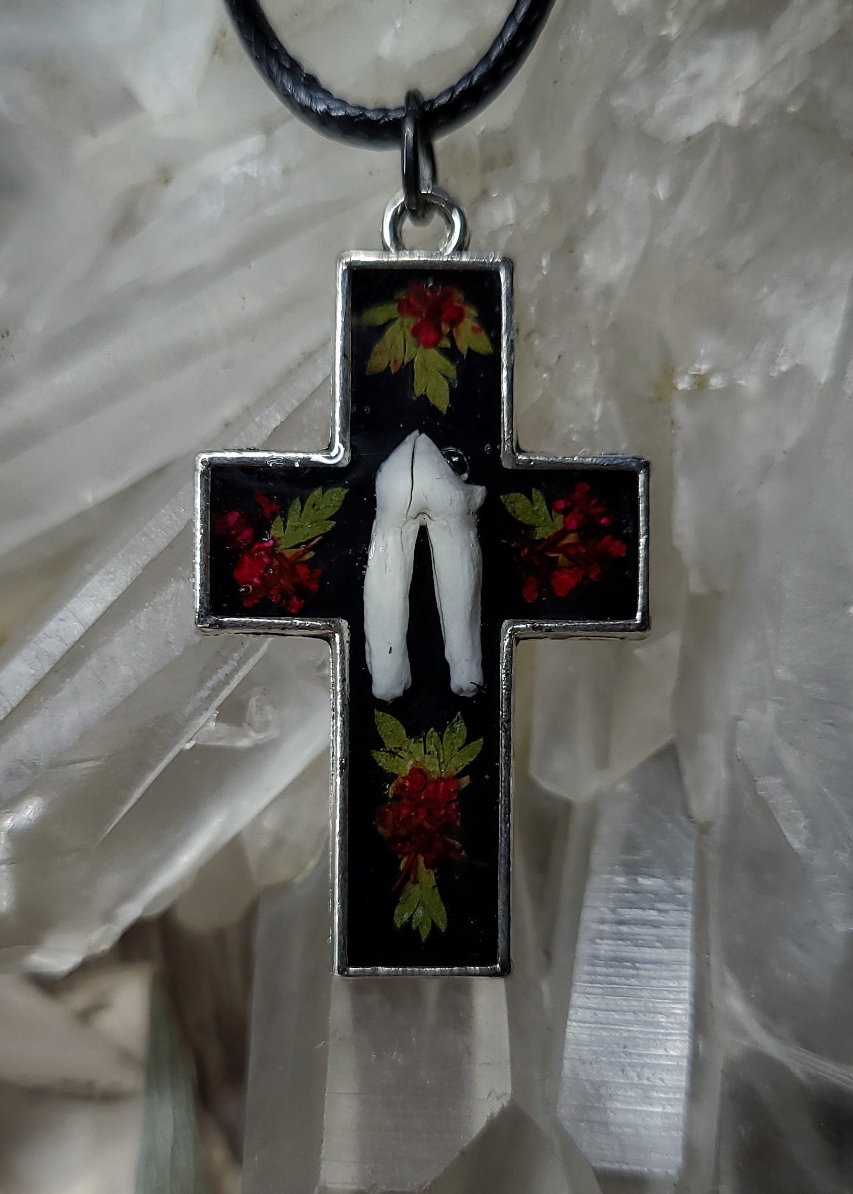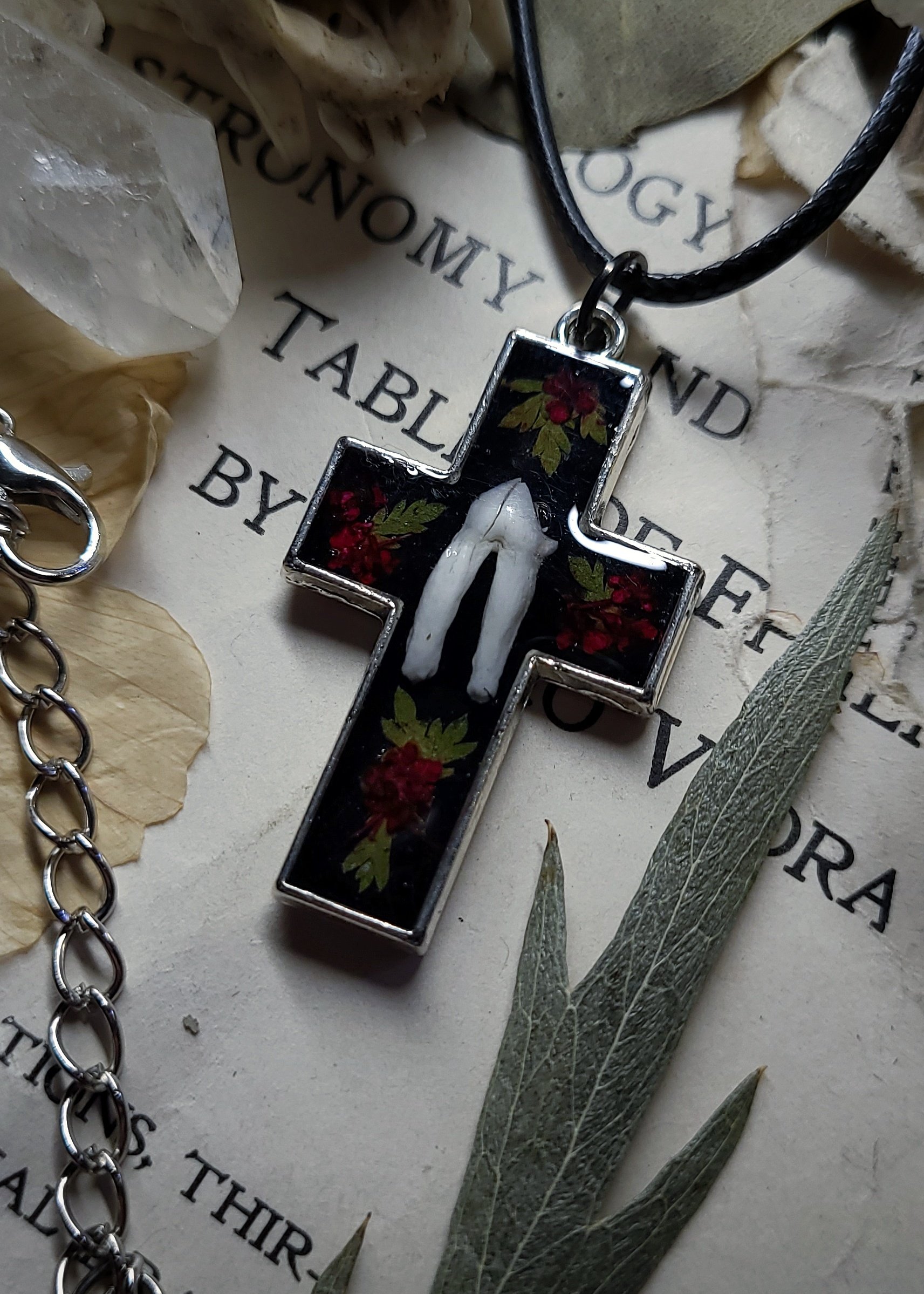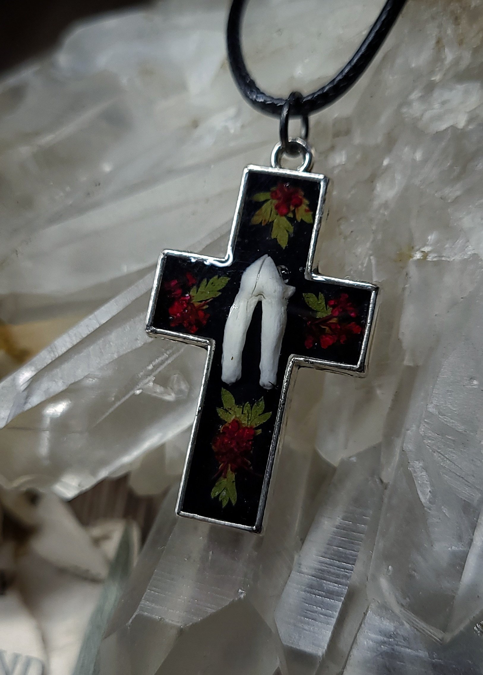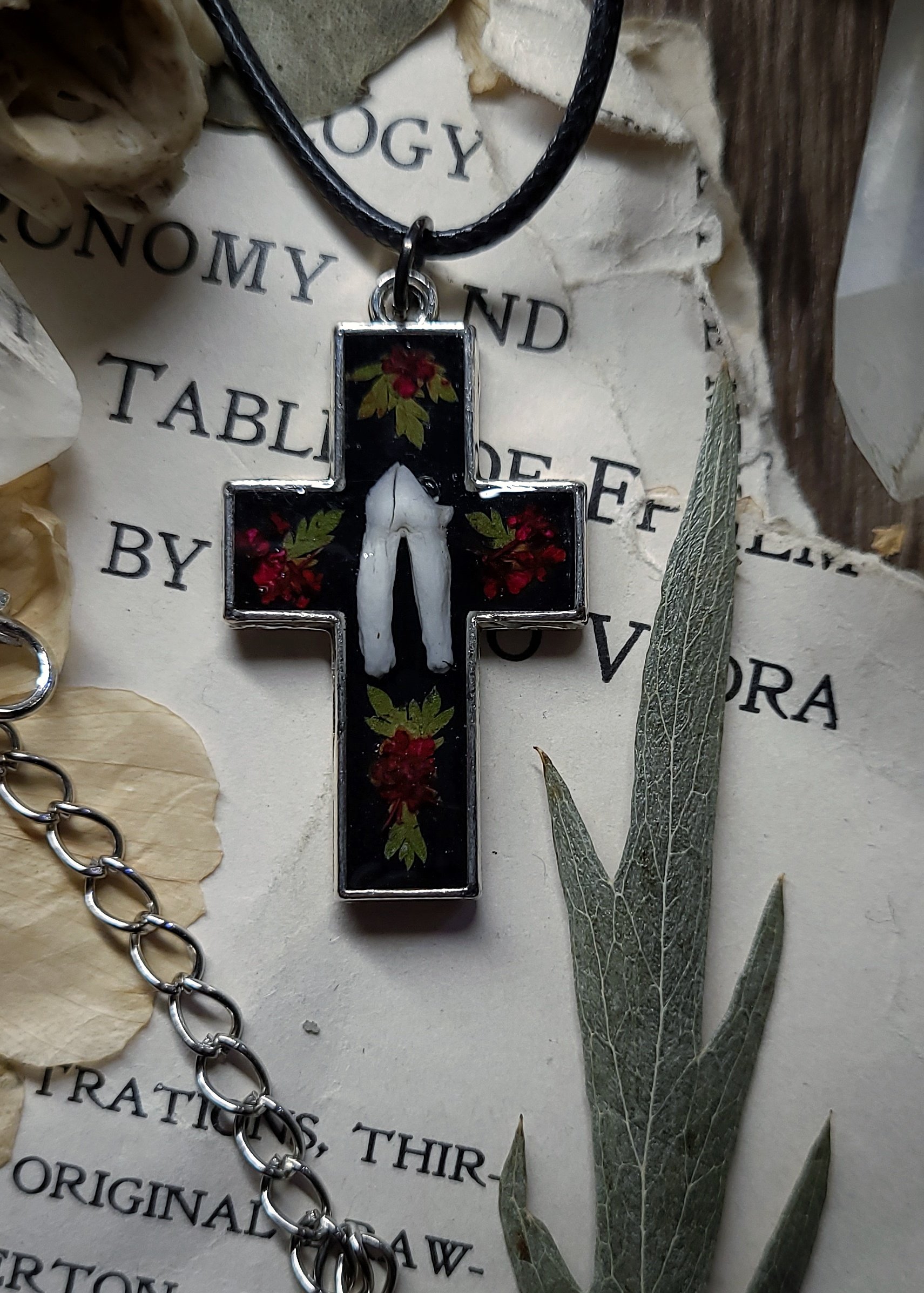 A single preserved opossum tooth with small crack and dried wildflowers is sealed on a shiny black background in clear resin inside of a silver brass cross shaped pendant.