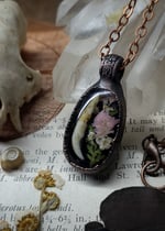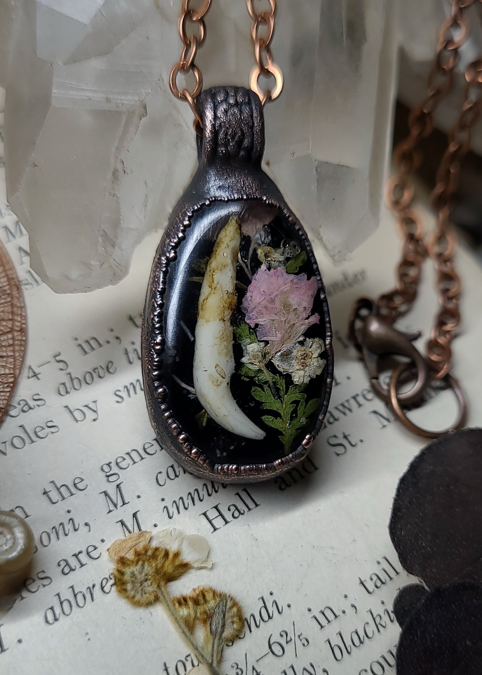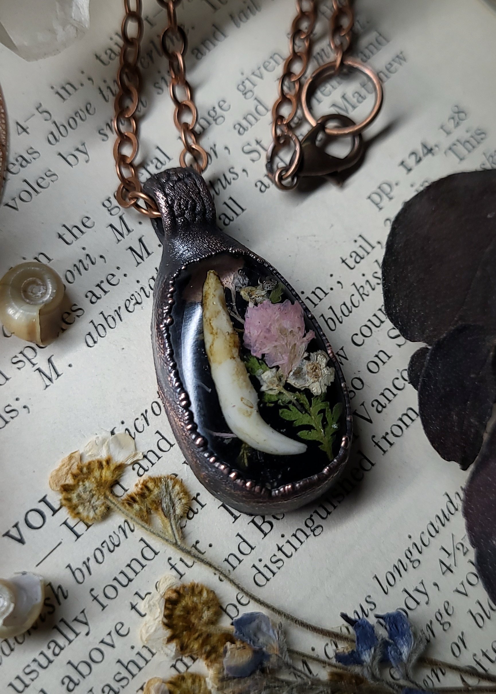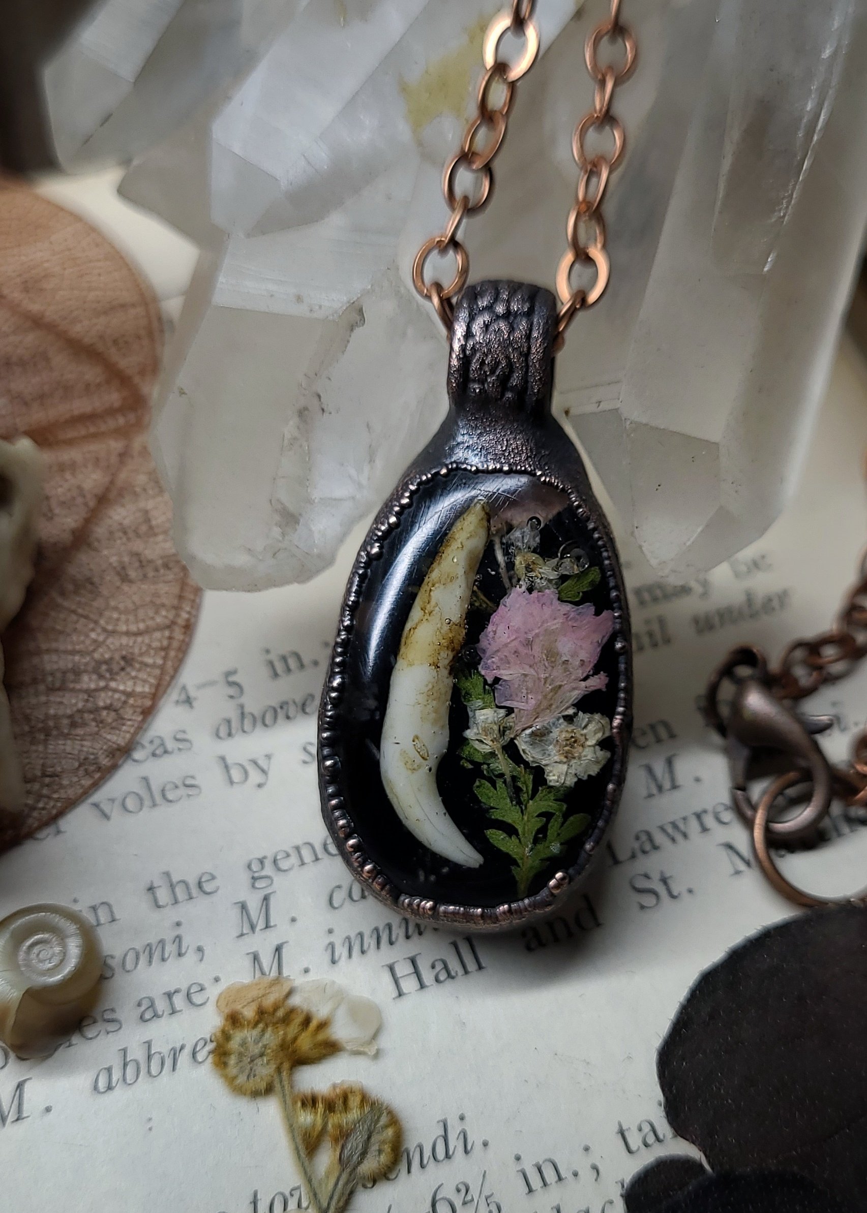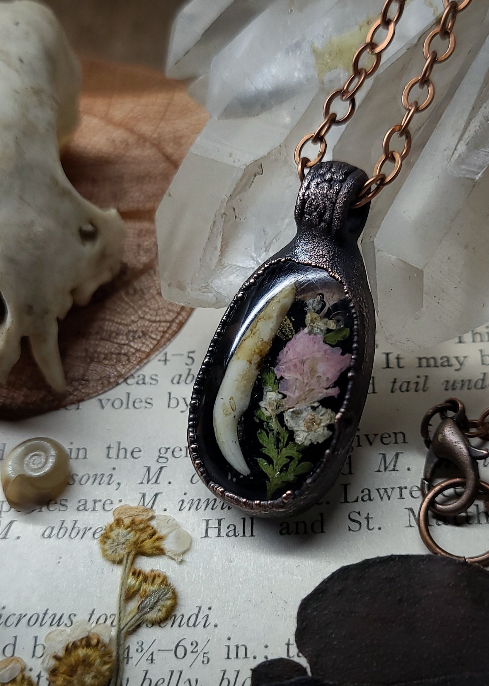 A foraged small opossum tooth with natural staining and dirt is sealed in clear resin with dried pink wildflowers and framed in thick and textured oxidized copper to last a lifetime.