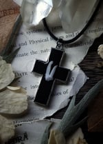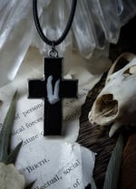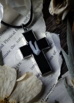 A single preserved opossum tooth is sealed on a shiny black background in clear resin inside of a silver brass cross shaped pendant.